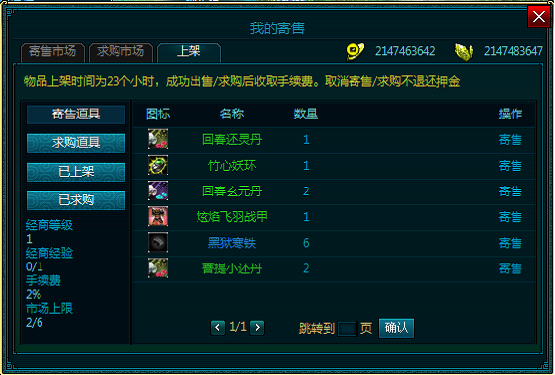 上架:显示玩家背包内物品,并可进行寄售、求购操作。左侧显示经商等级。