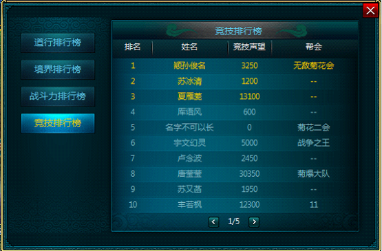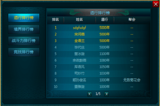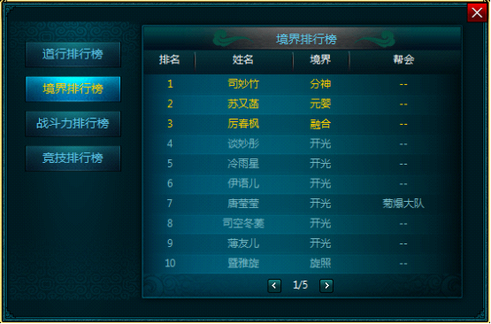 分为道行排行榜、境界排行榜、战斗力排行榜以及竞技排行榜