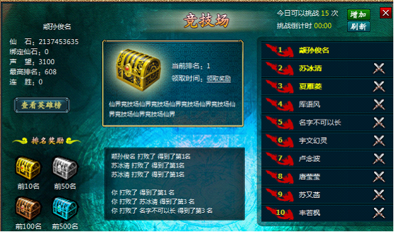 竞技场显示内容:人物基本信息、排名奖励、当前排名、主要战斗信息及挑战榜