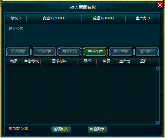 帮会生产:通过消耗生产力购买物品。