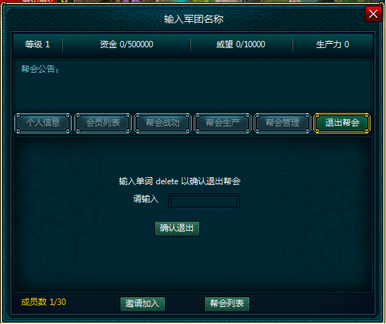 退出帮会:输入delete退出帮会;帮主需先进行帮主转让之后才可以退出帮会。