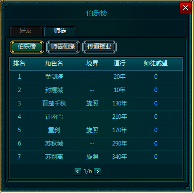 伯乐榜:显示玩家基本信息及师徒威望。