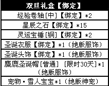 活动奖励:玩家完成“圣诞节雪花儿飘”任务获得[每日可完成2次]:“双旦礼盒”*3