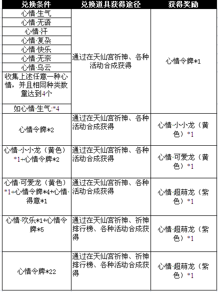 心情龙获得方式:可通过在祈神台萧升处祈神获得各种心情道具,收集不同数量和种类的心情道具,即可兑换限量版龙年—“超萌心情龙”