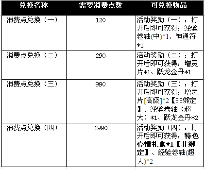 5、活动期间内,玩家使用消费点兑换道具时,只要积累到相应兑换点数可兑换的道具,即可完成道具兑换。