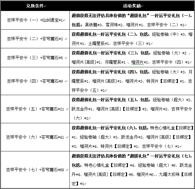 5、活动结束后,未使用的吉祥平安令(一)至(七)和好运平安礼包(一)至(七)将在1月16日12:00被删除,请玩家注意活动时间,在道具清除前将物品使用和兑换。时间到期后被系统清除的道具,官方将不予以补偿,请广大玩家特别注意活动时间!
