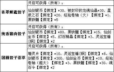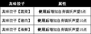 奖励为“真味饺子【蔬菜馅】【绑定】”*1(或者“真味饺子【猪肉馅】【绑定】”*1还或者是“真味饺子【海鲜馅】” *1)。同时玩家在各大主城的杂货商人那里也能购买到“上好的面皮”。