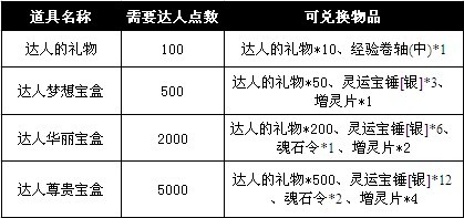 活动期间,消费1元宝即可获得1点达人点,即可在商城界面-“ 宝盒兑换”中兑换不同数量的道具“ 达人的礼物”。“ 达人的礼物”收集的越多,可以兑换的奖励越丰富!