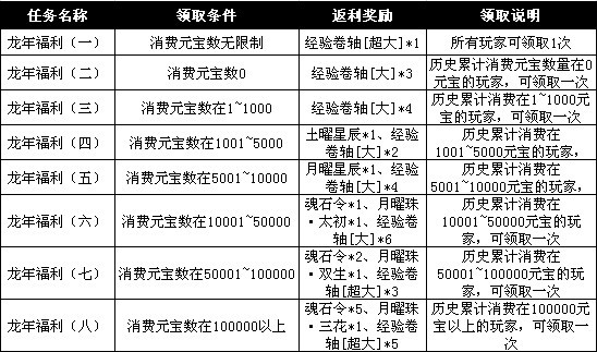 如一个角色完成了“龙年福利(二)”,在活动期间内又满足了“龙年福利(三)”的需求,即可领取到两个活动的奖励,以此类推;