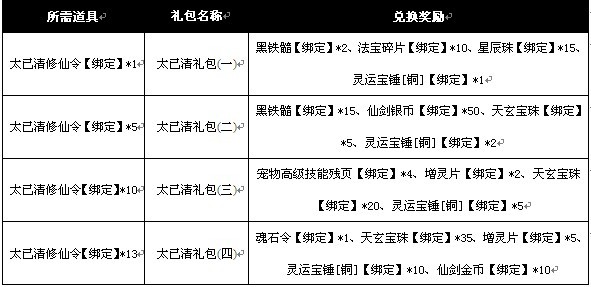 注:1、为了活动的公正公平,在3月13日18:00活动开启前会对玩家“太已清修仙令”、“戾气珠”、“太已清礼包(一)”、“太已清礼包(二)”、“太已清礼包(三)”、“太已清礼包(四)”道具进行清理。