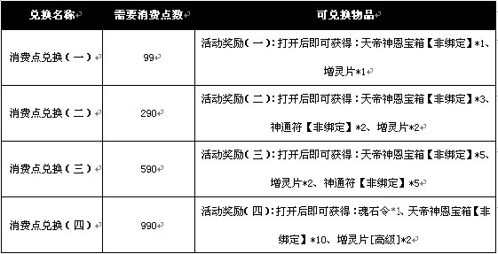 5、活动期间内,玩家使用消费点兑换道具时,只要积累到相应兑换点数可兑换的道具,即可完成道具兑换。