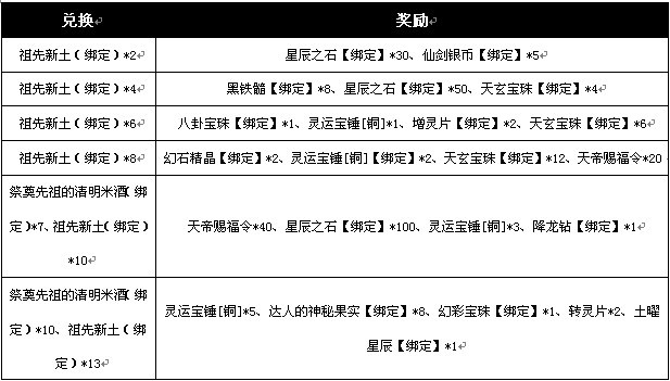 祖先新土【绑定】*1、黑铁髓【绑定】*1、碧灵珠【绑定】*1、祭奠先祖的清明米酒【绑定】*1
