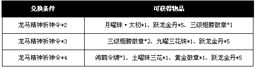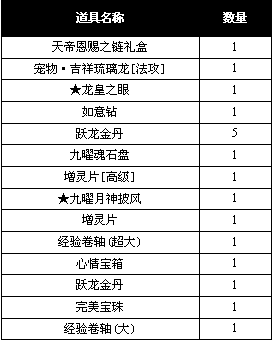 黄金徽章/青涩校园头饰【兑换券】/青涩校园上衣【兑换券】/如意钻/月曜珠•双生/九曜月华/天帝赐福令[999个]/碧海宝珠/天帝赐福令[200个]/土曜珠•太初/碧海宝珠/天玄宝珠/跃龙金丹/仙剑金币/仙剑银币
