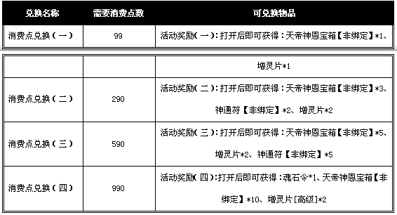 活动期间,只要消费1元宝即可获得1点消费点,即可在商城界面-宝盒领取中兑换不同数量的道具和天帝神恩宝箱。