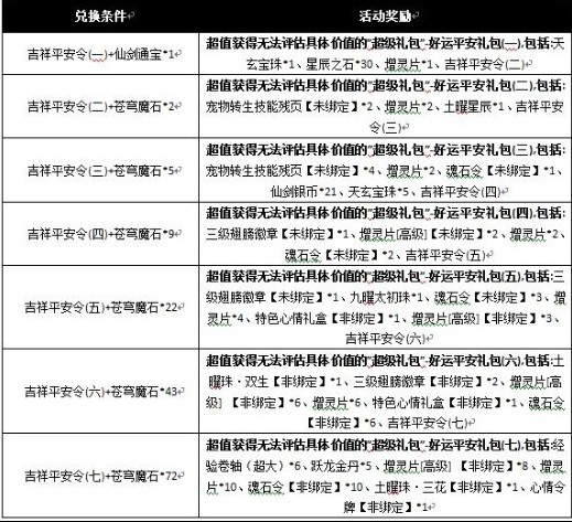 活动结束后,未使用的吉祥平安令(一)至(七)、好运平安礼包(一)至(七)将在5月8日10:00被删除,请玩家注意活动时间,在道具清除前将物品使用和兑换。时间到期后被系统清除的道具,官方将不予以补偿,请广大玩家特别注意活动时间!