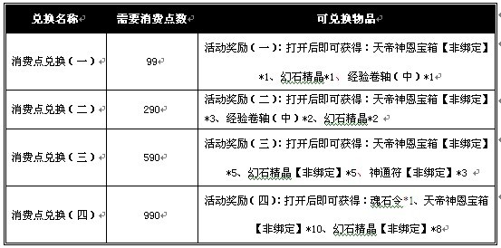 5、活动期间内,玩家使用消费点兑换道具时,只要积累到相应兑换点数可兑换的道具,即可完成道具兑换。