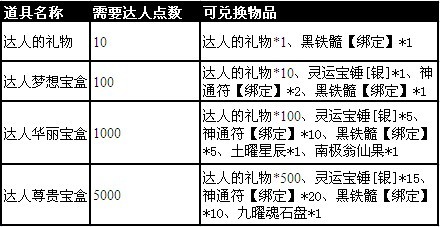 活动期间,消费1元宝即可获得1点达人点,即可在商城界面-“宝盒兑换”中兑换不同数量的道具“达人的礼物”。“达人的礼物”收集的越多,可以兑换的奖励越丰富!