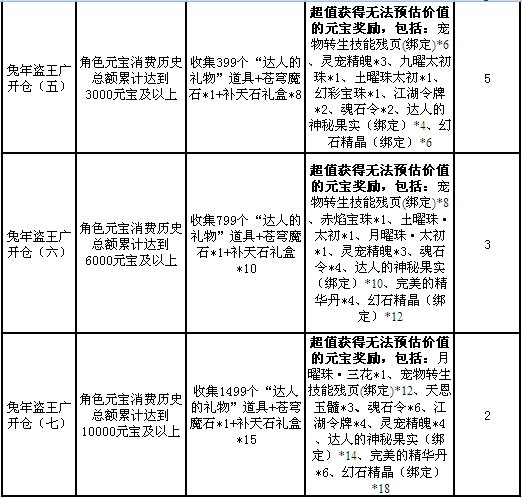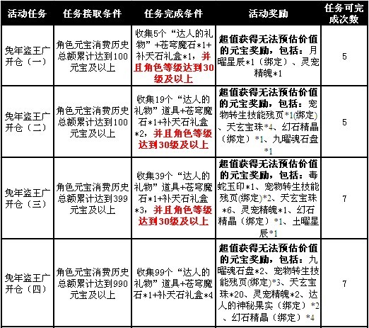 如果玩家历史消费达到10000元宝及以上,那么他可以接取对“盗王开仓啦(一)、(二)、(三)、(四)、(五)、(六)、(七)”,只要满足活动完成条件和完成次数,即可完成活动任务获得奖励。