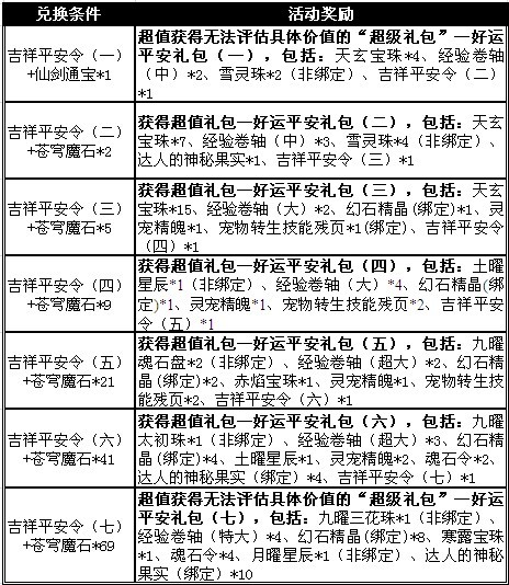 5、活动结束后,未使用的吉祥平安令(一)至(七)将在9月13日12:00被删除,请玩家注意活动时间,在道具清除前将物品使用和兑换。时间到期后被系统清除的道具,官方将不予以补偿,请广大玩家特别注意活动时间!