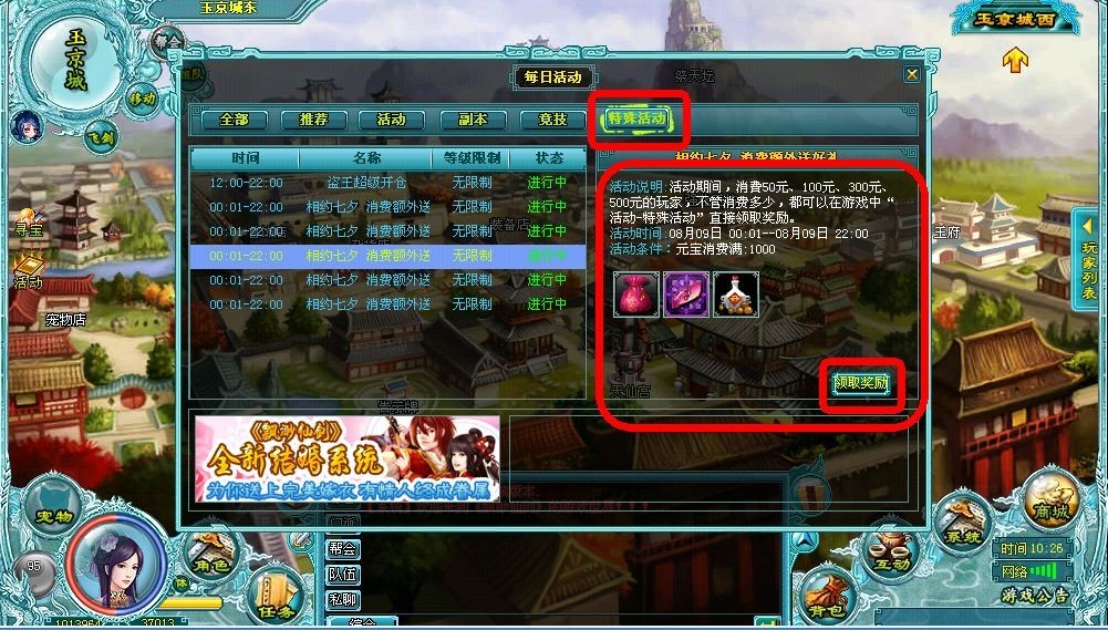 活动期间,消費599元的玩家可以在游戏中“活动-特殊活动”直接领取由7k7k《飘渺仙剑》运营团队为您送出的超值元宝或积分道具!