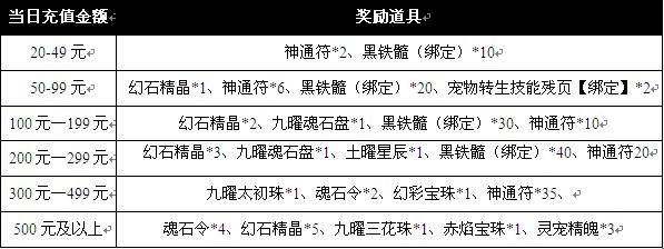 凡单笔充值20元、50元、100元、200元、300元、500元的玩家,不管充值多少,都将按照充值金额的≥50%超值返还等值元宝道具!这样给力的活动,赶快抓紧时间吧,机会不等人啊!