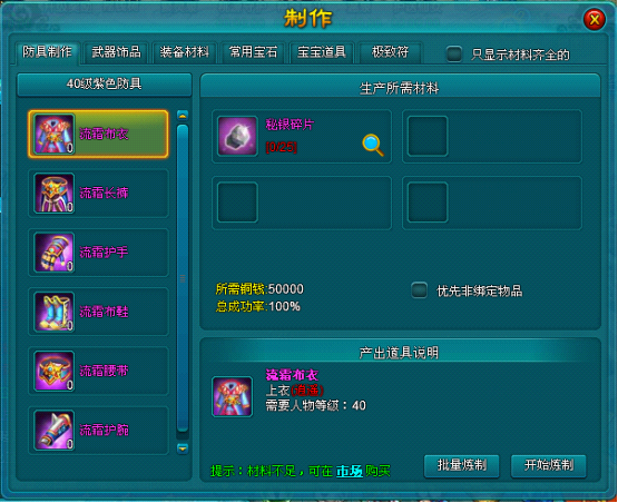 制作系统可以炼制紫色防具,紫色饰品、装备材料、常用宝石和丹药。收集足够的材料,点击“开始炼制”,即可完成制作操作。