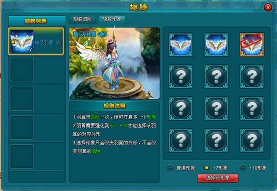 在不同形象的基础上,羽翼强化等级+7和+10还会有新的特效,让羽翼看起来更加的华丽。