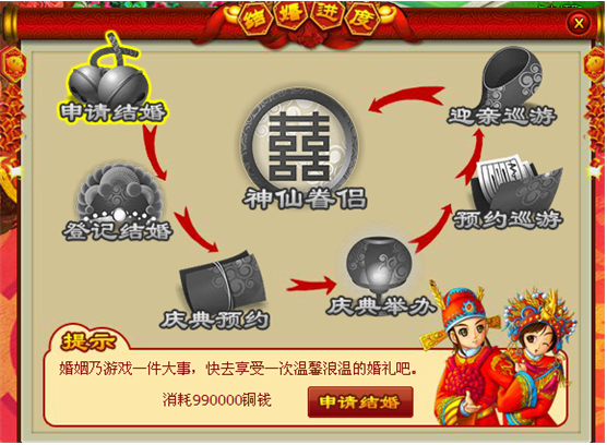 当您的眷侣同意结婚后就可以登记结婚,需要消耗990000铜钱