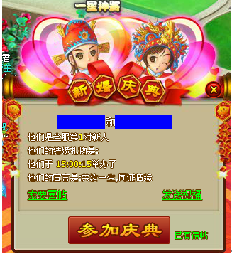 仙友们则会受到庆典提示,可以向新人发送祝福和索要喜帖哦!