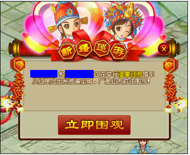 巡回过程中其他仙友将收到巡回消息,可点击立即围观前往新人巡回处~~新人双方可派发喜糖,围观的仙友拾取后可获得对应奖励。