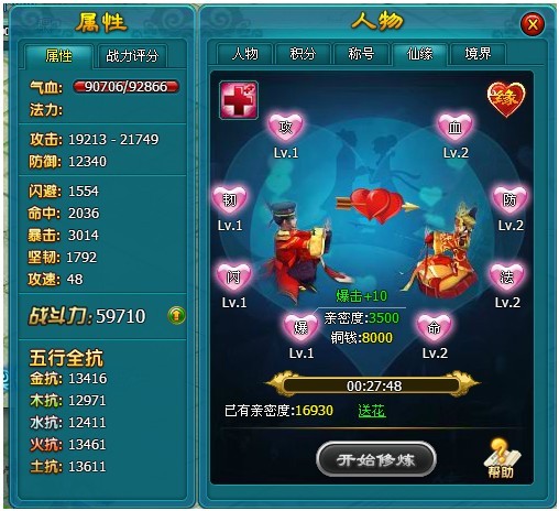 1.喜结良缘的仙友们将会获得夫妻属性加成,夫妻属性有气血、防御、法力、命中、暴击、闪避、坚韧、攻击。