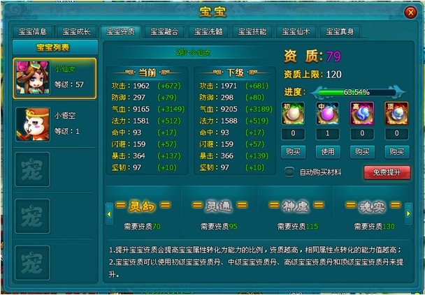 体质:影响宝宝的气血和法力;