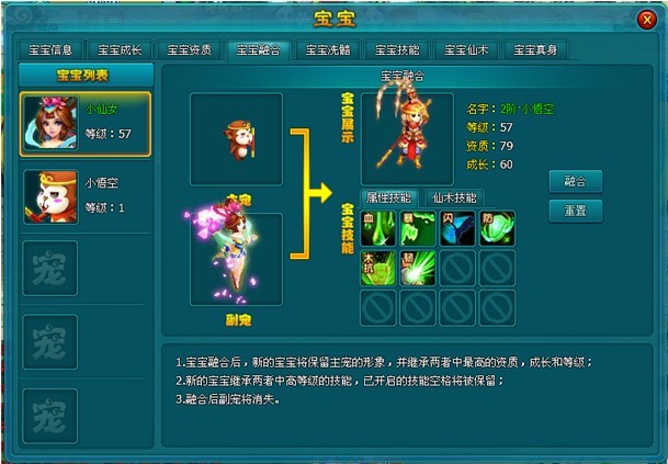 1、拖动宝宝列表中的宝宝头像到主宠和副宠处,可以进行宝宝融合操作。2、宝宝融合后将保留主宠的形象和属性分配比例,其他属性均取两者中的最高值来继承。因此宝宝融合可以让你随时随地更换宝宝的形象,而无需担心宝宝的实力下降。