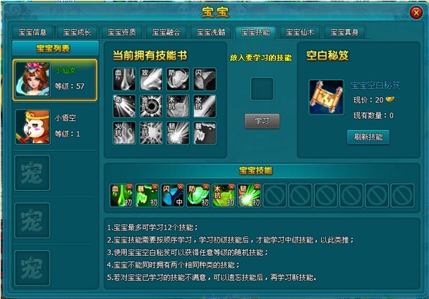 1、宝宝技能书通过刷新宝宝空白秘笈,并载入技能获得。