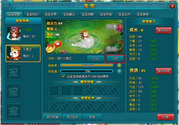 宝宝升级可以获得10点属性,并平均分配到宝宝的5项属性中,通过宝宝洗髓可以改变宝宝属性的分配比例。