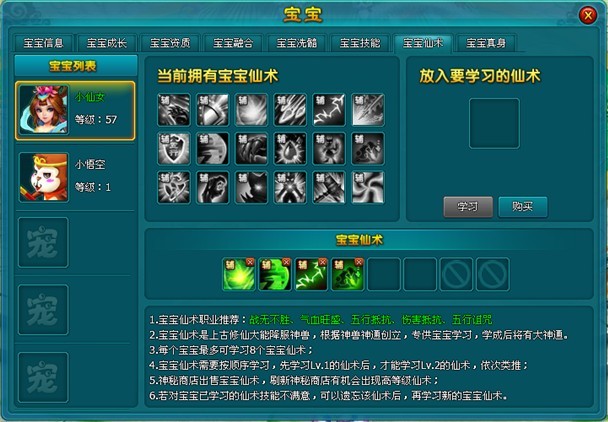 一阶以上的宝宝才可以学习宝宝仙术(成长30,资质30即可以自动进阶为一阶宝宝);每个宝宝最多可学习6个宝宝仙术;宝宝仙术需要按顺序学习,先学习Lv.1的仙术后,才能学习Lv.2的仙术,依次类推;