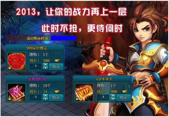 活动内容:活动期间,等级大于等于40级的仙友可在活动面板购买VIP半年卡、999朵玫瑰、坐骑进阶符(用于坐骑进阶)将打折出售,限时限量抢购哦,众多优惠,等您来享!
