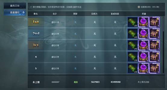 3.玩家将出战全体将领,给魔将吕布造成伤害累计达到目标条件可获得阶段性奖励,造成伤害越高,奖励越多。另外系统将对玩家单次挑战造成的累计伤害进行排名,排名奖励将在冬季24点通过有奖发放。