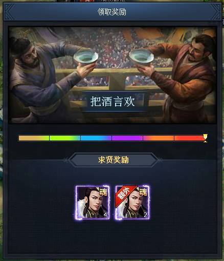 4.求贤奖励:求贤结束后,可获得大量求贤将领对应的将魂碎片。选择与求贤将领有宿命关系的将领出访能获得更多的碎片奖励。