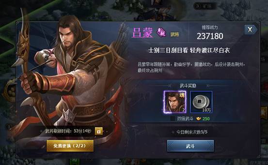 3.武斗奖励:武斗胜利可获得该将领的将魂奖励,选用双倍武斗更可获得双倍奖励却只需消耗1武斗次数。