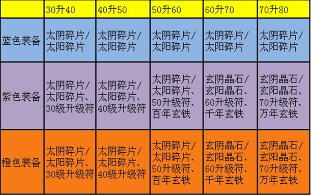 除了时装、翅膀、佩饰外,所有的蓝色、紫色、橙色装备均可升级。其中蓝色装备升级只需升级材料,紫色、橙色装备升级需要消耗升级材料和升级符。