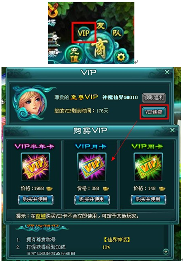 成为《神魔仙界》VIP会员,可以享受到超值的服务和特殊尊贵身份显示。