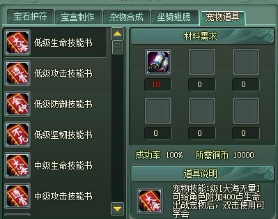 5)技能,宠物技能可以在商城中购买部分低级技能,在神炉中可以用技能残卷合成低级技能和用相应量的宠物技能书进行书本升级