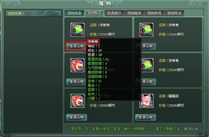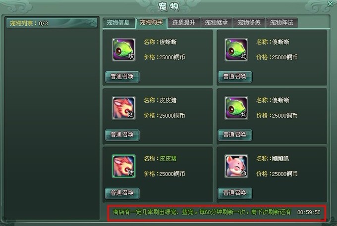 另外,获得绿色和蓝色宠物还可以通过刷新,不过每小时才刷新一次,因此需要耐心等待。