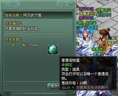 2、绿色宠物获得:通过完成25级支线任务“阿贝的下落”,就可以奖励绿色宠物蛋一个,直接使用即可召唤绿色宠物。