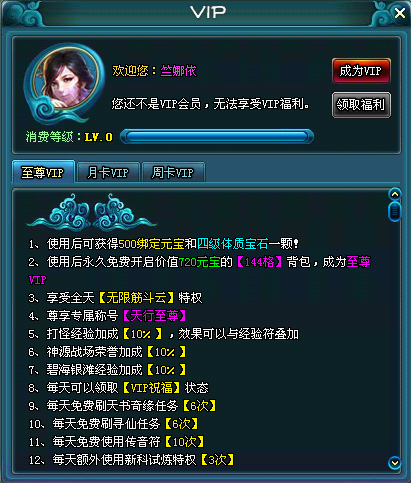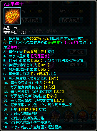 使用后成为至尊VIP玩家,有效期为半年并且可享受的功能: