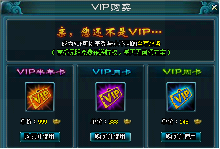 分别是:普通VIP(VIP周卡)、高级VIP(VIP月卡)和至尊VIP(VIP半年卡)。