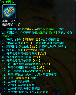 使用后成为普通VIP玩家,有效其为一周并且享受: