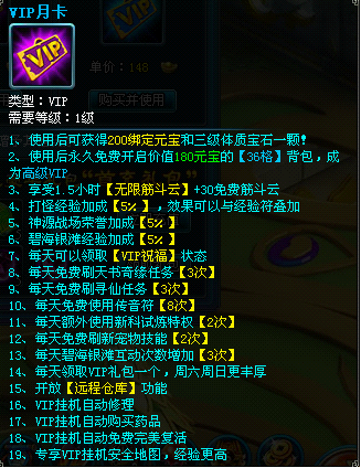 使用后成为高级VIP玩家,有效期为一个月并且享受:
