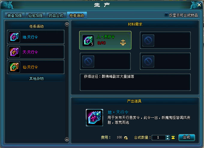 点击右上角的“生产”进入生产界面,所有仙友都可以使用此功能;消耗低级物品合成更高级的同类物品,100%合成成功,部分物品的合成需要消耗少量铜币。